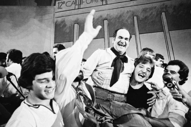 Na Califórnia de 1982, Leonardo (1938 - 2010), ao centro, celebra a vitória de "Tertúlia", que será interpretada hoje por Os SerranosFoto: Tude Munhoz / Agencia RBS